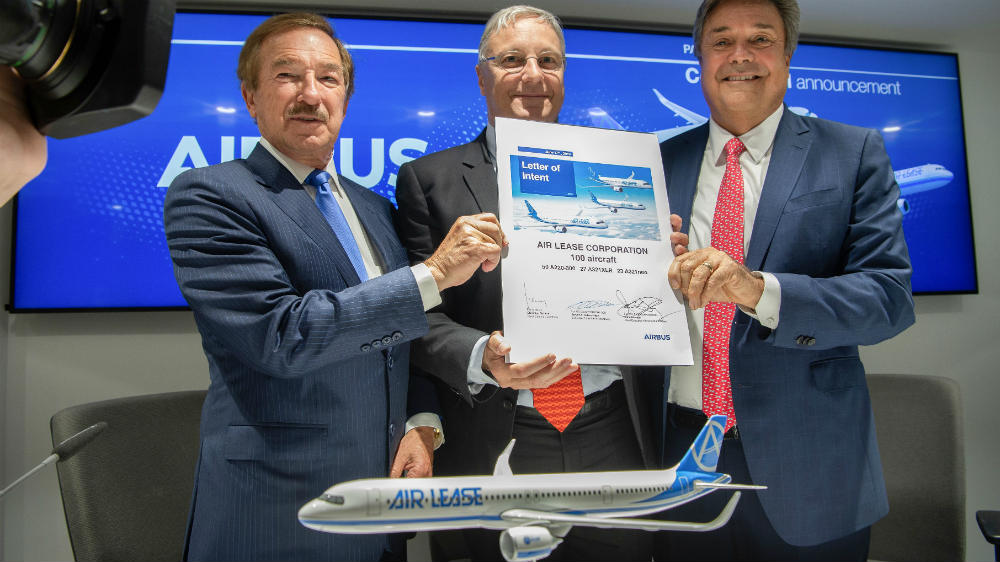 Airbus won an order for 100 aircraft from Air Lease Corp, one of the world’s most closely watched jet purchasers.