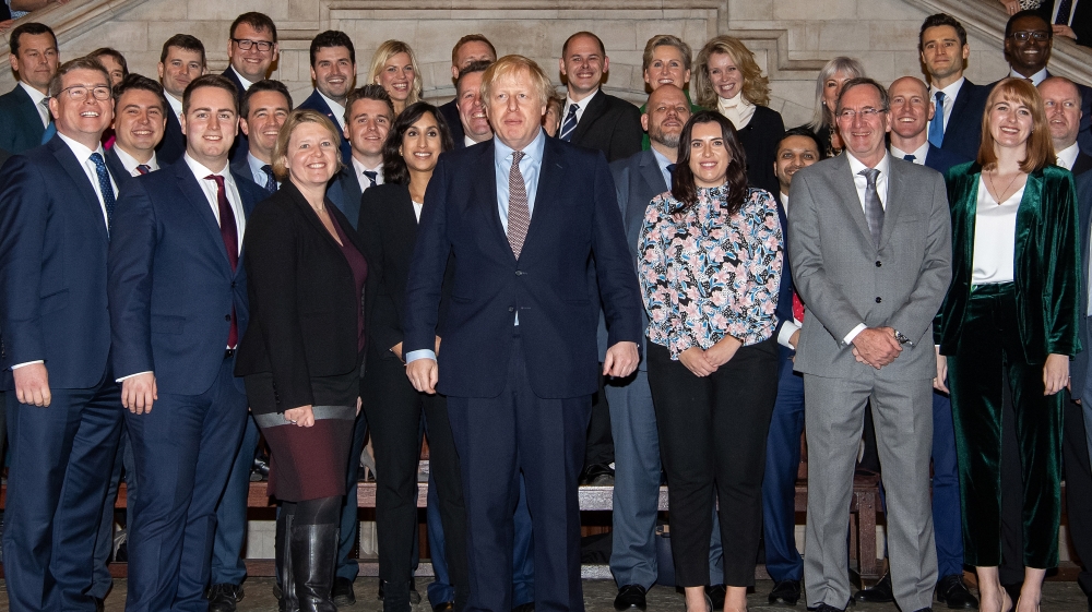 PM Boris Johnson, centre, poses for a group photo with newly-elected Conservative MPs in the Palace of Westminster [Leon Neal/Pool/AFP]