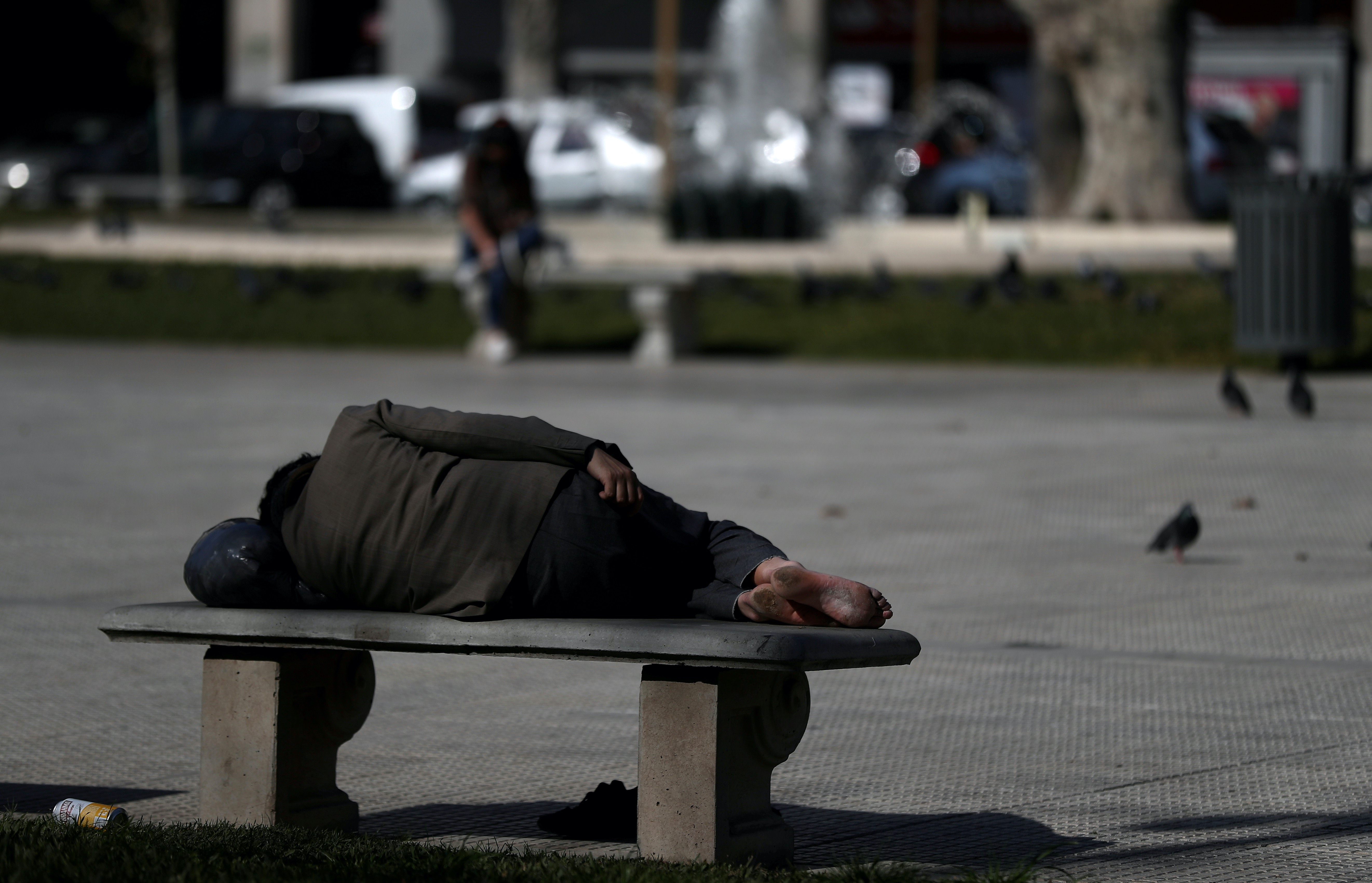 A homeless man sleeps on a bench outside the Casa Rosada Presidential Palace during the coronavirus outbreak, in Buenos Aires, Argentina [File: Agustin Marcarian/Reuters]