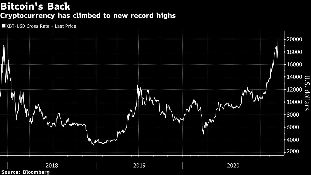 The world’s largest digital-asset rallied as much as 8.7% to $19,857.03 Monday, pushing this year’s surge to more than 170%, according to data compiled by Bloomberg. It traded at a few cents for several years after its late 2008 launch by an unknown software developer in the wake of the global financial crash. Shares of companies with exposure to cryptocurrencies also jumped, with Marathon Patent Group Inc. and Riot Blockchain Inc. each rising at least 22%. MicroStrategy Inc., a software company that has been buying Bitcoin, added 20%.