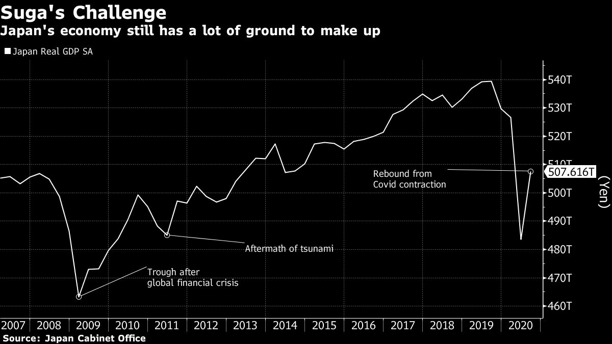 The stimulus package could also be a means to ensure the prime minister’s political survival, according to the Bloomberg news agency. Suga needs his own mandate after taking the helm of the the governing Liberal Democratic Party four months ago, when Shinzo Abe stepped down because of ill health. That means he needs to keep the economy supported until September, the likely date for a nationwide poll.