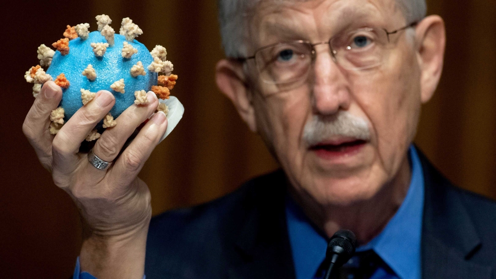 Dr Francis Collins, director of the National Institutes of Health (NIH), holding up a model of COVID-19, during a US Senate hearing on Operation Warp Speed in Washington, DC [Saul Loeb/Pool via Reuters]