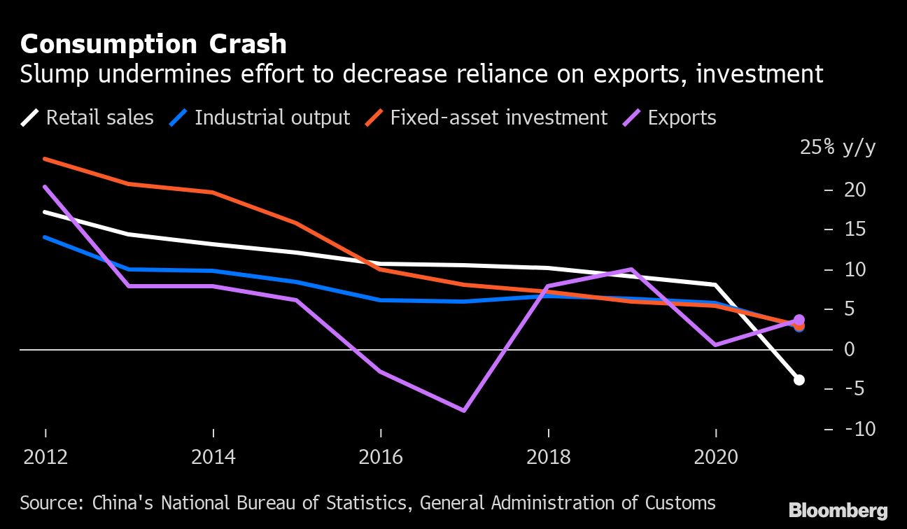 China’s per-capita consumption, after adjusting for inflation, dropped 4% in 2020. That’s comparable with forecasts for U.S. personal consumption spending, which is projected to have fallen 3.8% in 2020, according to a Bloomberg survey.