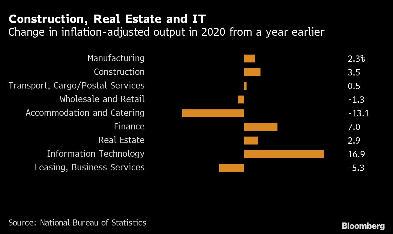 Overall service sector growth was 2.1% in 2020, lagging the expansion of GDP, while the industrial sector which includes manufacturing and construction grew 2.6%. There were some bright-spots for the services sector in 2020 according to a sectoral breakdown of growth released by the National Bureau of Statistics, with strong expansion in information technology and finance.