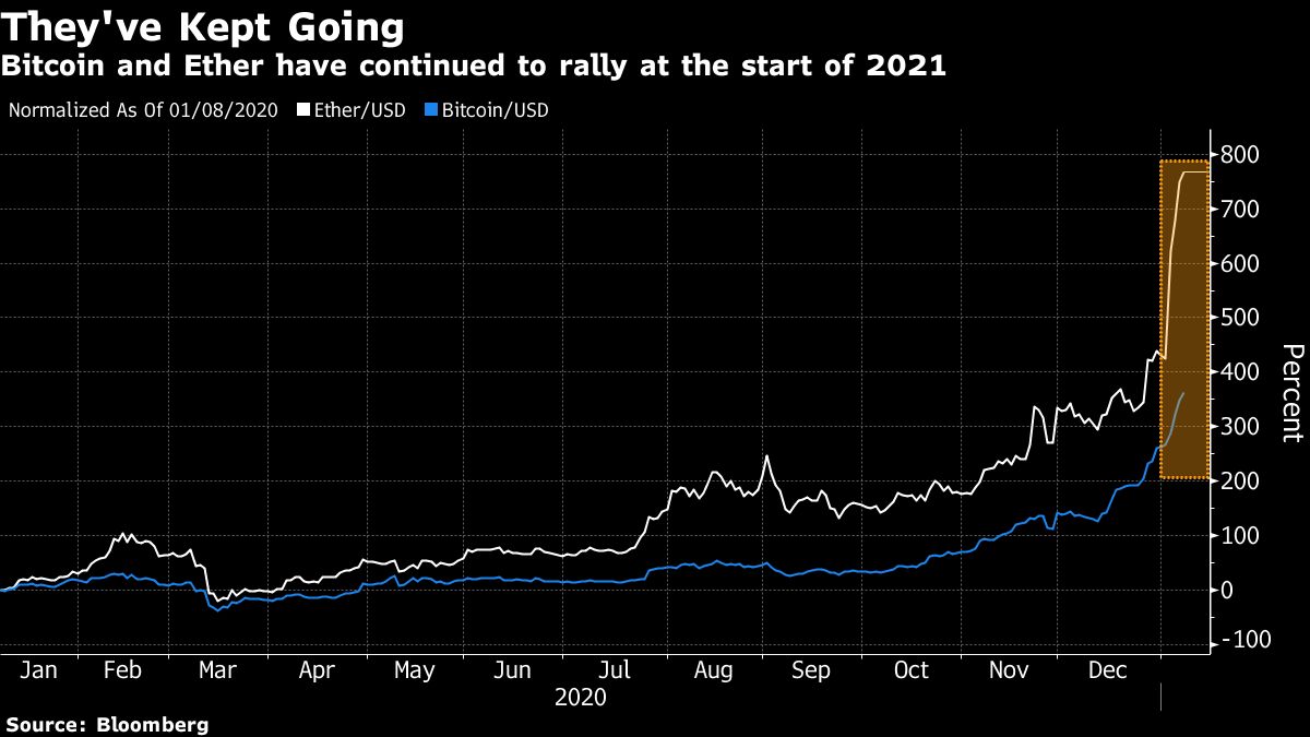 Bitcoin rose as much as 11% on Thursday to $40,065 and has more than quadrupled in the past year, according to a composite of prices compiled by Bloomberg. It accounts for about two-thirds of cryptocurrency market value, followed by Ether at about 13%, according to CoinGecko data.