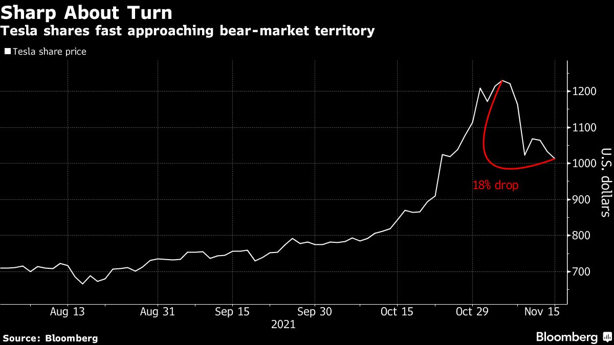Tesla Inc. shares are nearing bear-market territory after tumbling over the past week as Chief Executive Officer Elon Musk sold a chunk of his stock in the electric vehicle maker, and hinted that he may sell more.