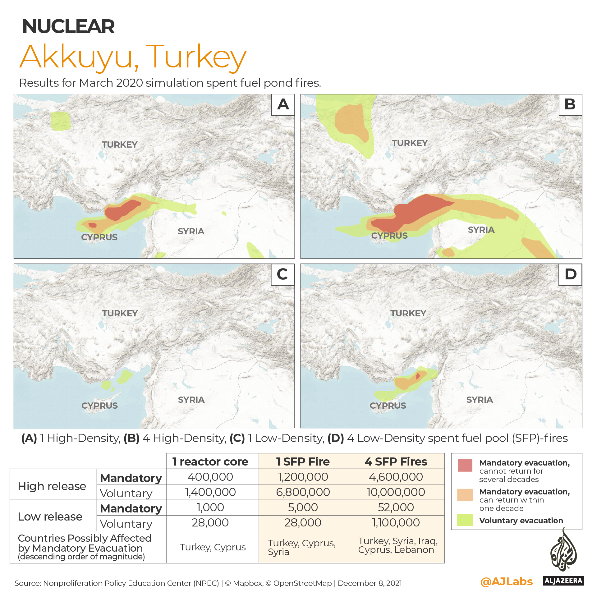 The three scenarios involving a missile or drone attack on the Akkuyu nuclear power plant predicted average population displacements ranging from 1,000 mandatory and 28,000 voluntary evacuations in low-radiological release simulation involving a reactor core breach, to 4.6 million mandatory and 10 million voluntary evacuations if a densely packed spent fuel pond is hit resulting in a high release of Cs-137.