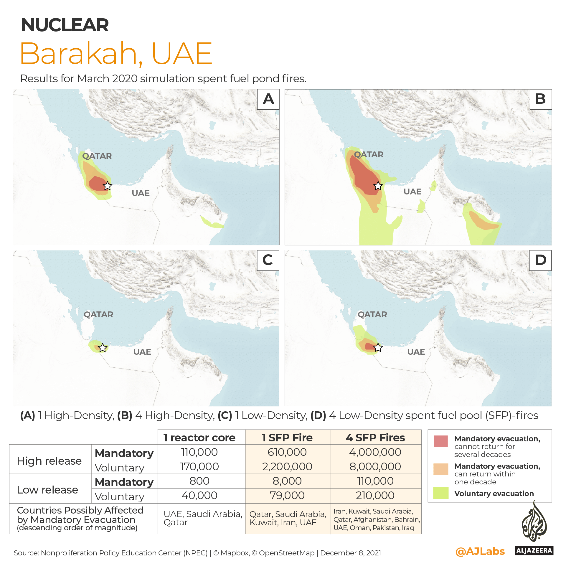 The three scenarios involving a missile or drone attack on the Barakah nuclear power plant predicted average population displacements ranging from 800 mandatory and 40,000 voluntary evacuations in a low-radiological release simulation involving a core breach, to 4 million mandatory and 8 million voluntary evacuations if a densely packed spent fuel pond is hit resulting in a high release of Cs-137.