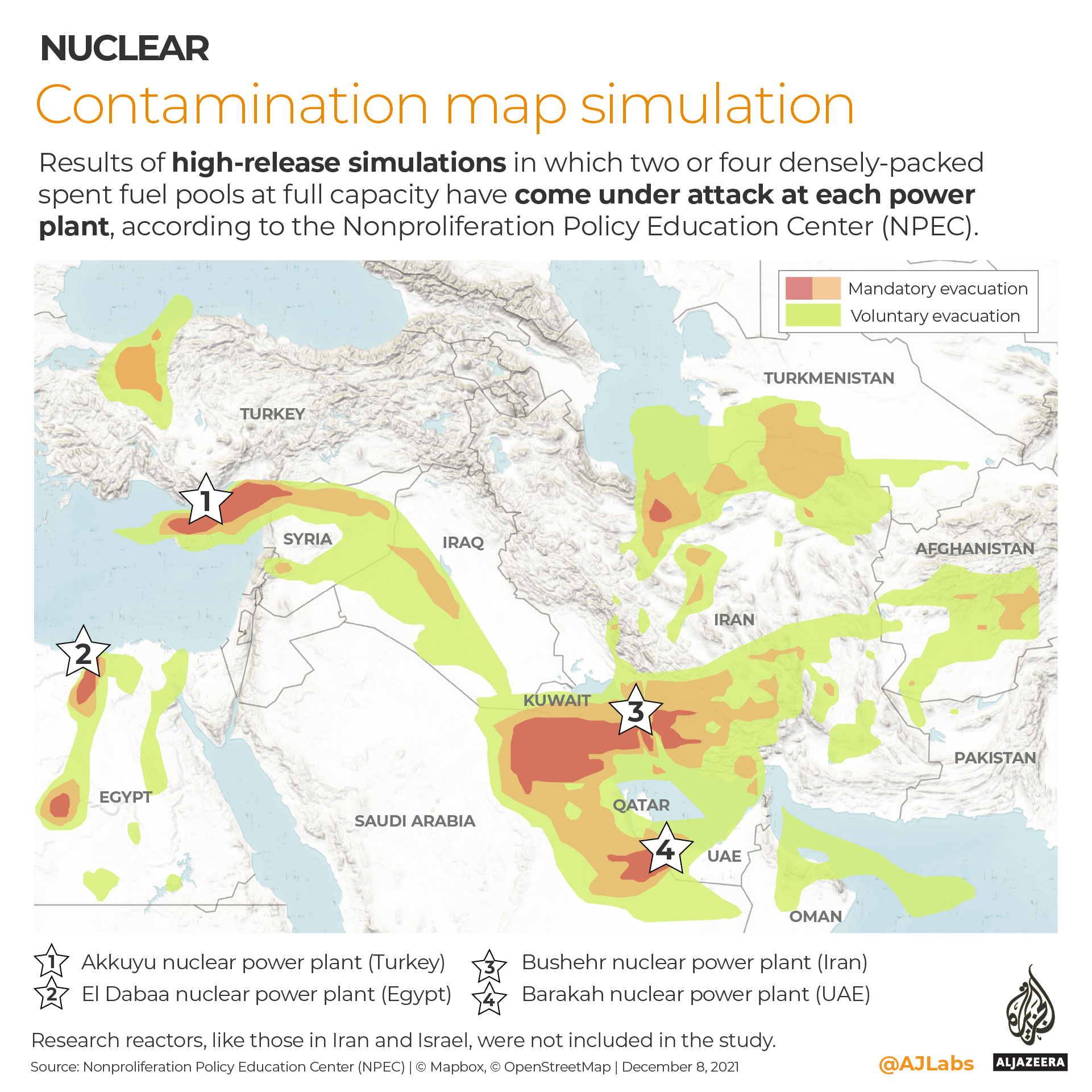 The four facilities chosen for the scenarios include the UAE’s Barakah power plant, Iran’s Bushehr, the plant under construction at Akkuyu in Turkey, and the site of Egypt’s planned commercial nuclear power station at El Dabaa.