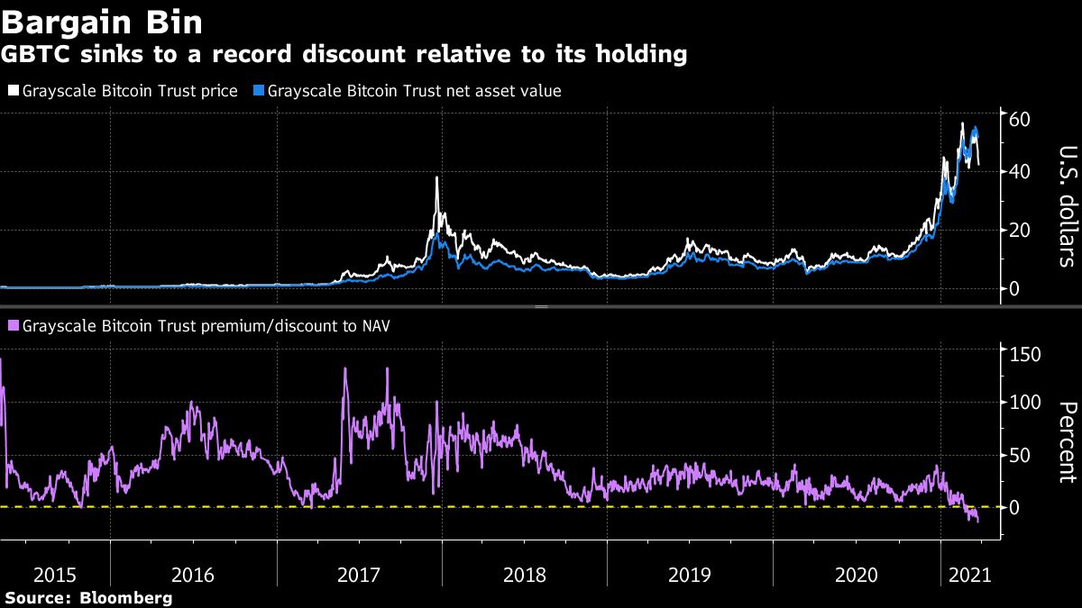 The $29.4 billion Grayscale Bitcoin Trust (ticker GBTC) has dropped about 20% so far this week, nearly double the decline in the world’s largest cryptocurrency. GBTC closed over 14% below the value of its underlying holdings on Wednesday as a result — a record discount, according to data compiled by Bloomberg. The dislocation has deepened despite Grayscale Investment LLC parent Digital Currency Group Inc.’s plans to purchase up to $250 million worth of GBTC shares.