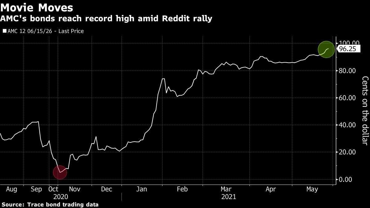Debt tied to AMC has rallied alongside shares, setting new highs in recent days. The company’s bonds, which were trading at a low of 5 cents in November, are inching close to par, according to Trace trading data. That debt carries a hefty coupon of 12% for the notes due 2026.