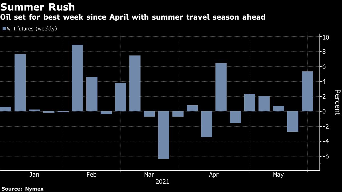 Oil headed for its biggest weekly gain since the middle of April ahead of the U.S. Memorial Day weekend that kicks off the country’s summer driving season.