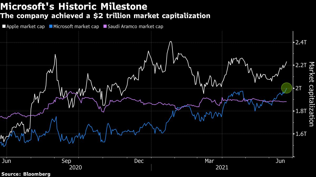 Its shares rose as much as 1.2% in New York on Tuesday, enough for the software company to briefly join Apple Inc. as one of only two companies trading at such a lofty value before closing pennies short of the mark at $265.51. Saudi Aramco eclipsed that threshold briefly in December 2019, but currently has a market value of about $1.9 trillion.