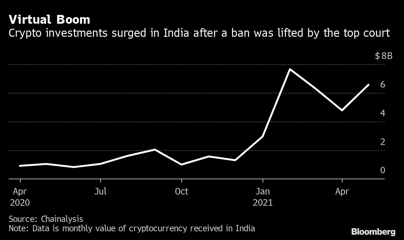 In India, where households own more than 25,000 tonnes of gold, investments in crypto grew from about $200 million to nearly $40 billion in the past year, according to Chainalysis. That’s despite outright hostility toward the asset class from the central bank and a proposed trading ban.