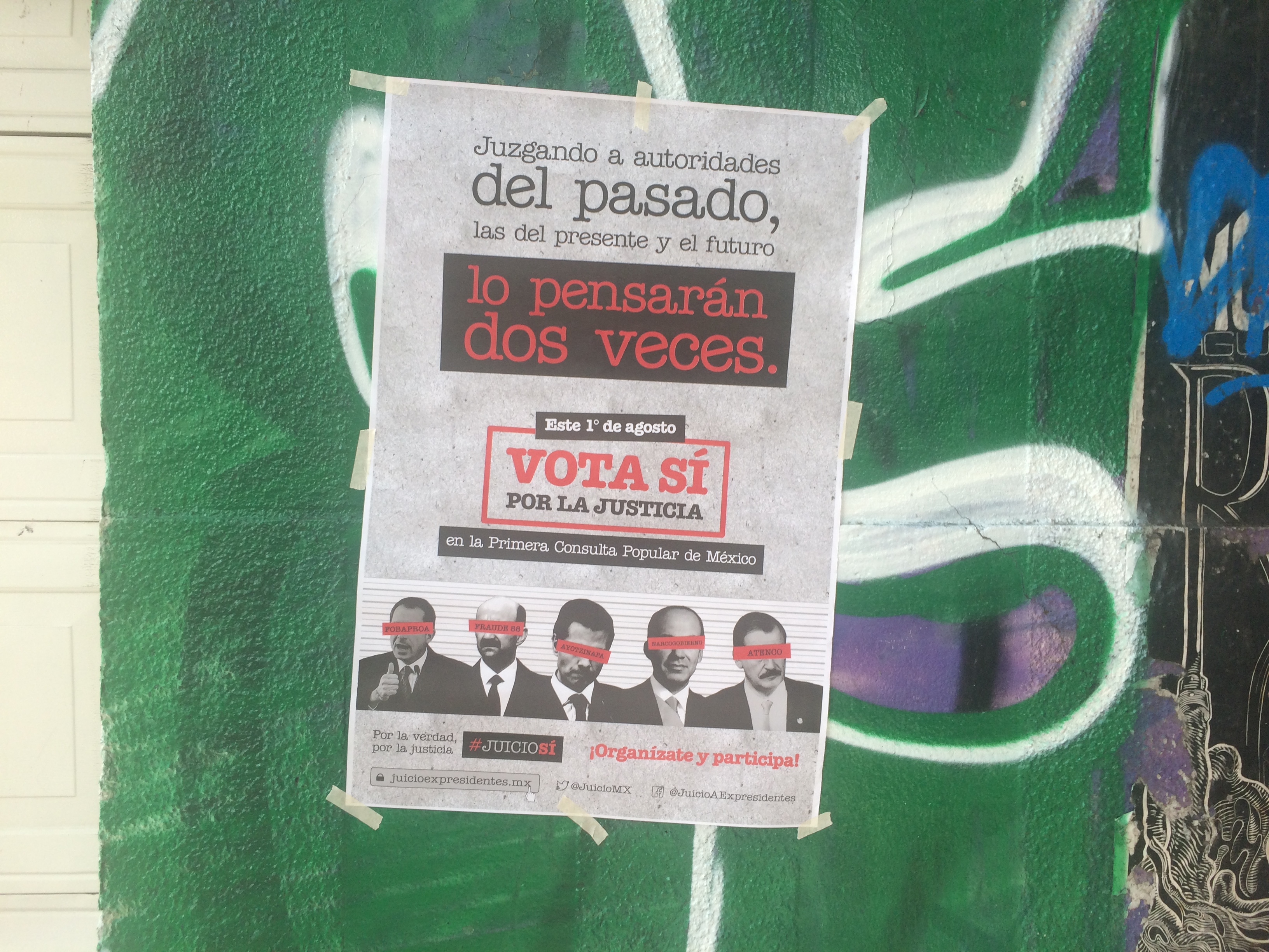 Each man has his eyes covered with words referring to a major scandal that took place during his administration. Underneath is a hashtag that reads #JudgementYesImpunityNo.