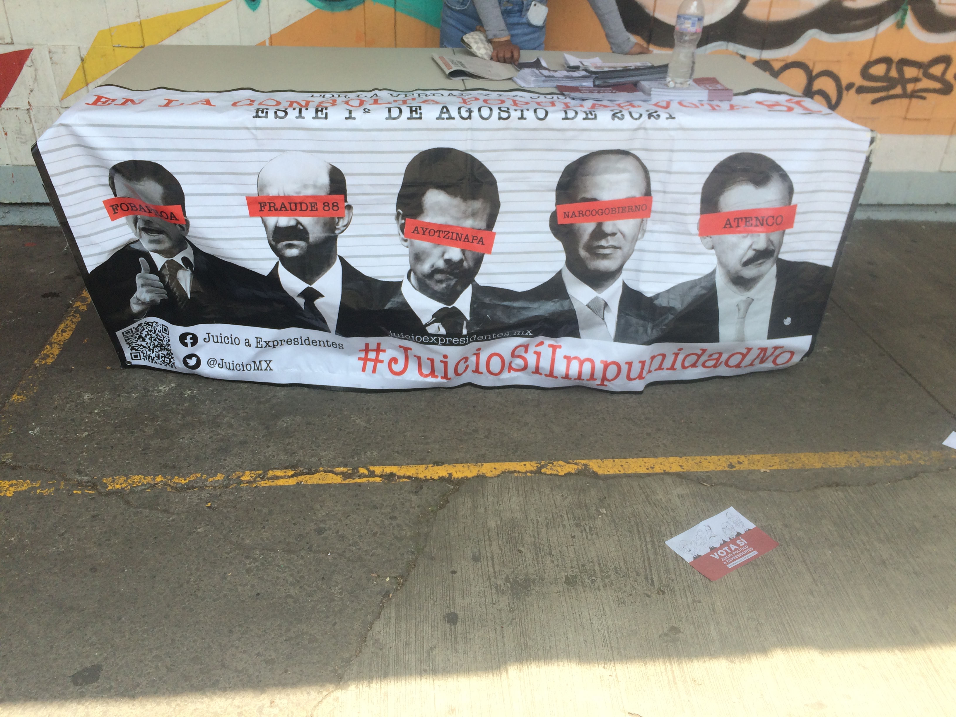 The posters are part of a campaign to turn out voters on Sunday for a referendum that asks Mexicans whether they agree the country should “undertake a process of shedding light on the political decisions made in past years by political actors, aimed at guaranteeing justice and the rights of potential victims”.