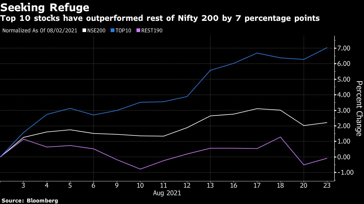 Showing just how concentrated the rally has become in recent weeks, a market cap-weighted basket of the biggest 10 stocks in the NSE Nifty 200 Index has outperformed the other 190 stocks by seven percentage points this month.