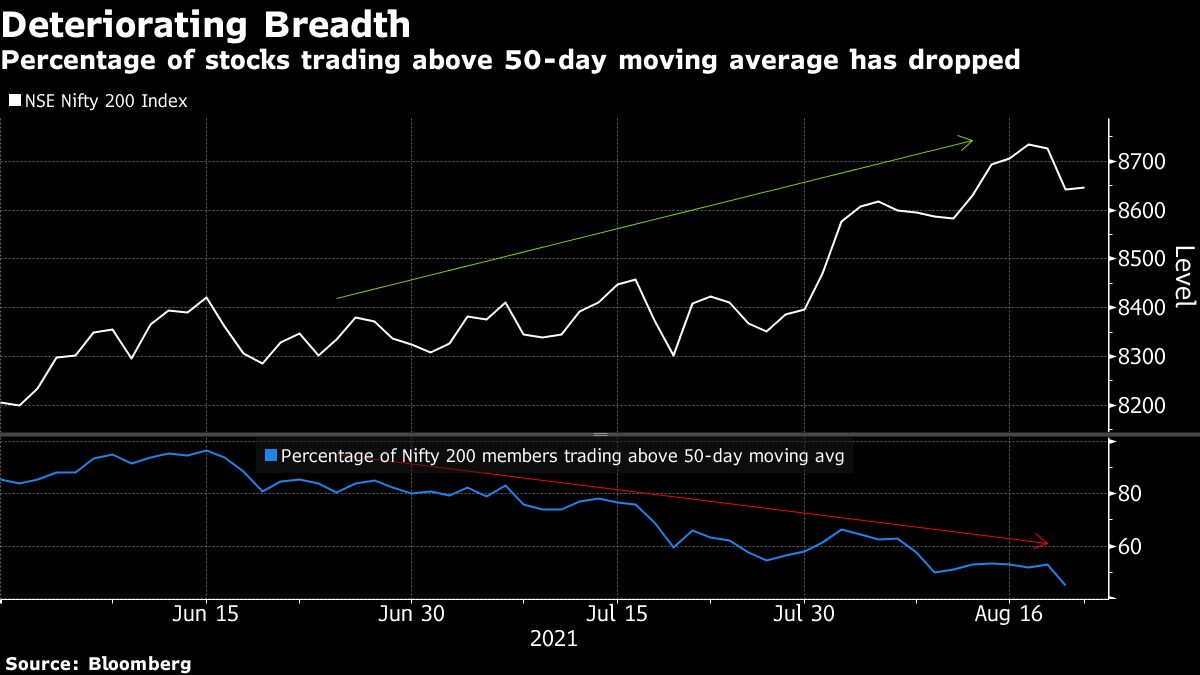 In another potentially worrying sign, participation in the rally is thinning. Even as the Nifty 200 set a series of fresh record highs, the number of stocks in the gauge trading above their 50-day moving averages has tumbled to about 45%, from nearly 100% in June.