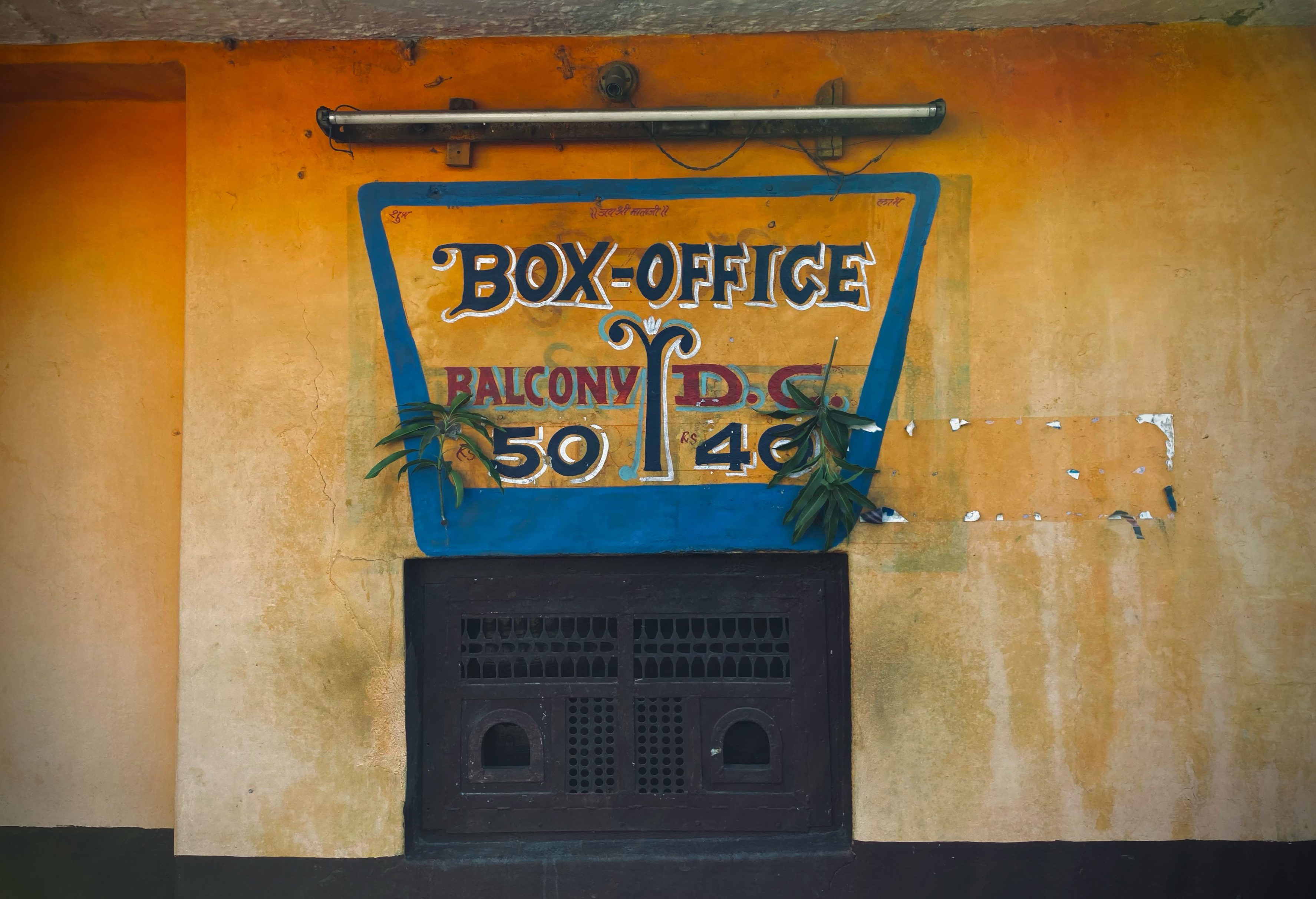 His photos capture this diversity in remarkable detail. From a literal hole-in-the-wall ticket window at a cinema in Jaipur to an ornate sculpted window at Roxy Talkies in Agra, designed to match seamlessly with the window of the adjoining mazaar (shrine). A ceiling with bold circles, lines and scalloped edges rimmed in light at Patiala’s Phul Theatre contrasts with the weathered exterior of an abandoned cinema in Sawai Madhopur, its past as a railway yard evident in the arched gates through which broad- and narrow-gauge tracks would pass. And a sweeping staircase is flanked by a bannister carved with music notes in a Delhi cinema, while an apsara (celestial dancer) looks out over the dust-laden grand lobby of a theatre in Pune.