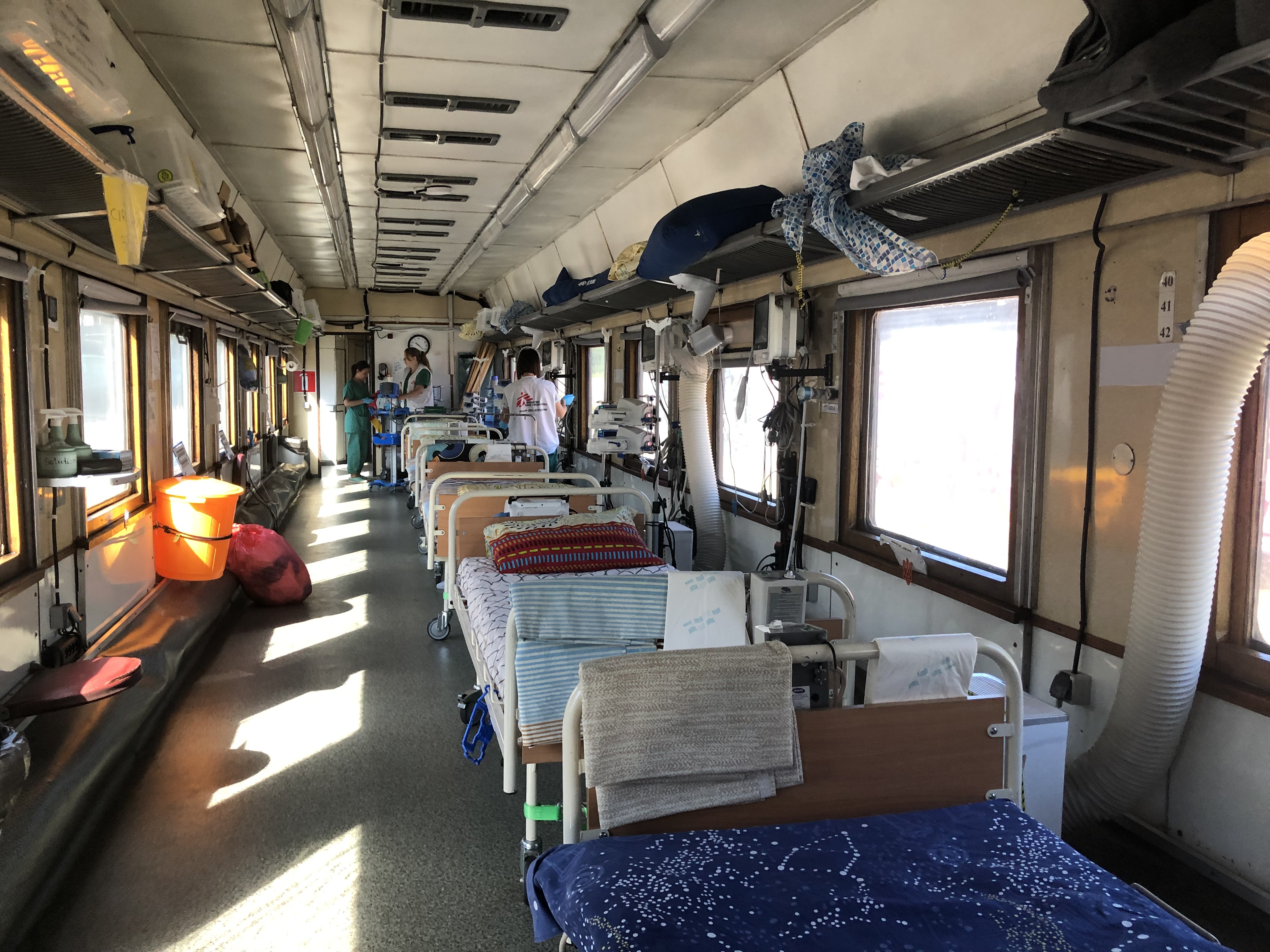 MSF currently runs Ukraine’s only known specialised medical train, carrying patients from hospitals in the embattled east to hospitals in the west that are considered safer. The train’s carriages have had the seats removed and been refitted with beds, generators for oxygen and medical devices and an intensive care unit.