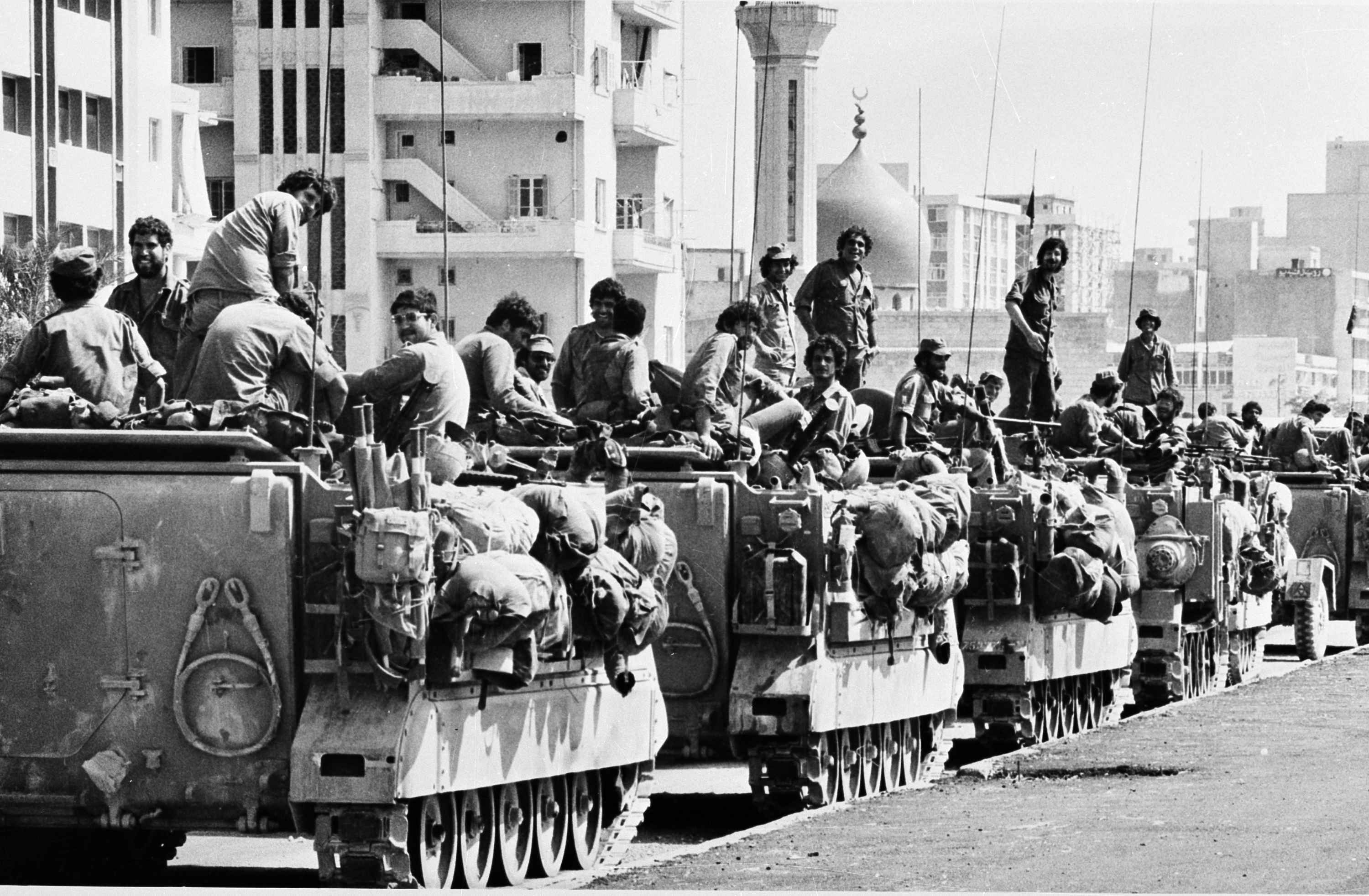 Israeli armoured personnel carriers near a mosque on the outskirts of the Lebanese capital of Beirut, June 16, 1982 [Rina CastelnuovoAP Photo]