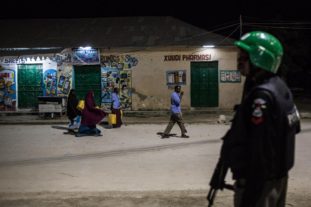 On this evening the AMISOM police were optimistic about the impact night patrols were having in Mogadishu. Illuminated by the solar lights, women fetched water, men chattered outside their shopfronts and boys played football in the dusty streets, activities previously unseen after dark just nine months ago.