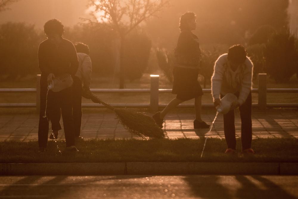 Pyongyang, North Korea – It’s the beginning of a new day in North Korea’s capital. Just before dawn, the only lights switched on on a downtown street are ones illuminating two huge portraits of the country’s founder Kim Il Sung and his son, Kim Jong Il.
