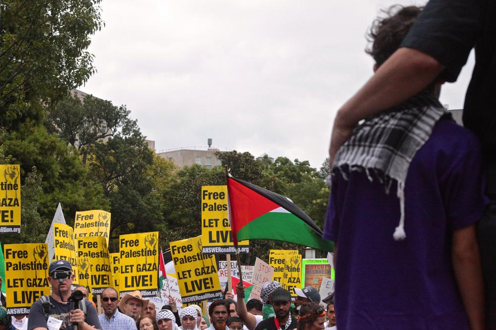 Demonstrators carried symbolic coffins draped in the Palestinian flag to represent the nearly 1,700 Palestinians killed by the Israeli bombardment, many of them women and children. More than 8,500 have been injured since the offensive began July 8. The protesters chanted slogans like, “Free, free Palestine, killing children is a crime,” and “Five, six, seven eight, Israel is an apartheid state.”