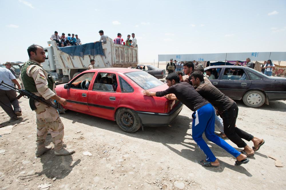 Iraqis push a car past Kurdish security forces at the Khazer checkpoint between Nineveh and Erbil provinces on July 23.