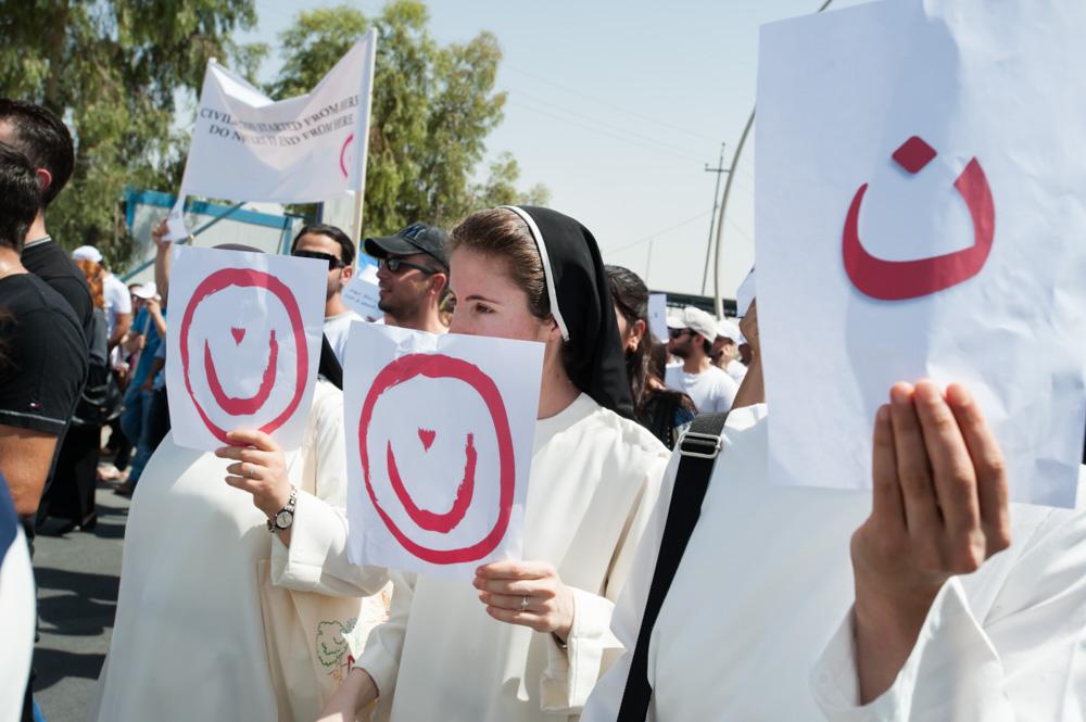 As news of this practice spread, the symbol was converted to a badge of solidarity by Christians and Muslims alike. Twitter hashtags like #WeAreN and #IAmNazrene quickly spread, with many replacing their profile photos with graphics depicting the letter being used by the Islamic State group to mark homes.