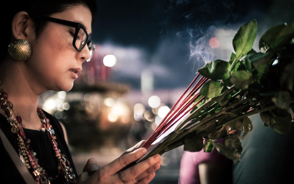 They buy some roses, light some incense sticks, and recite a prayer written on a small piece of paper while gazing up at the gleaming temple and it’s resident golden statue, Trimultari, the God of Love.