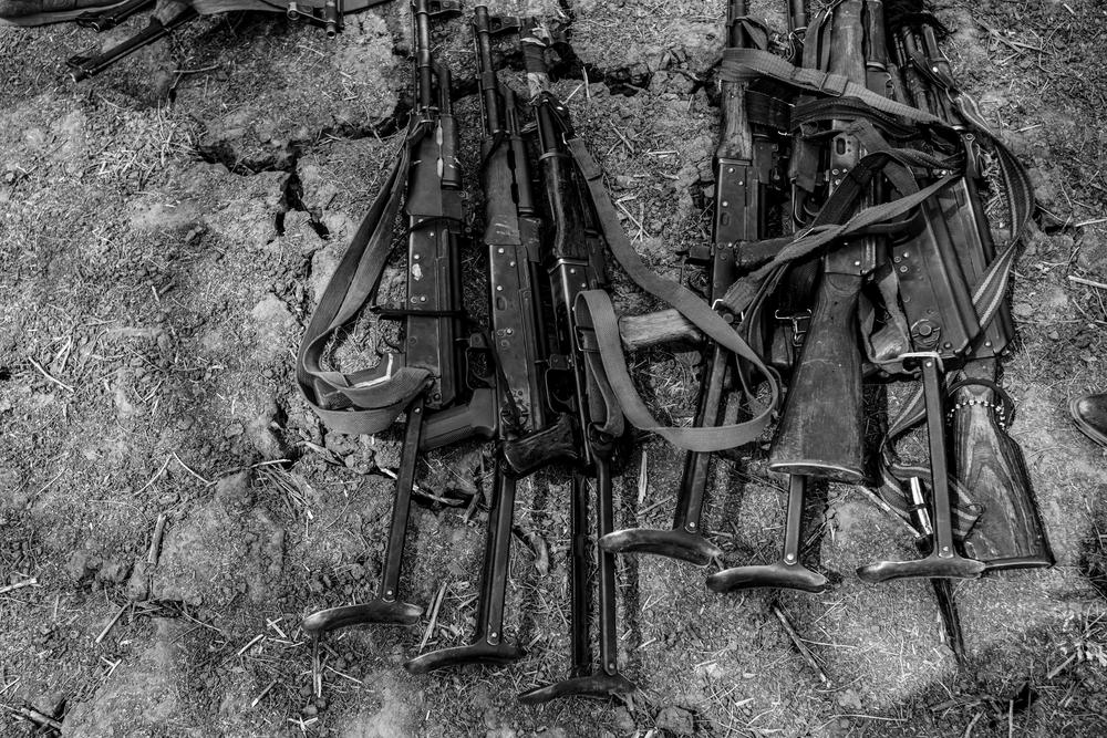 Discarded, guns are piled in the dirt.