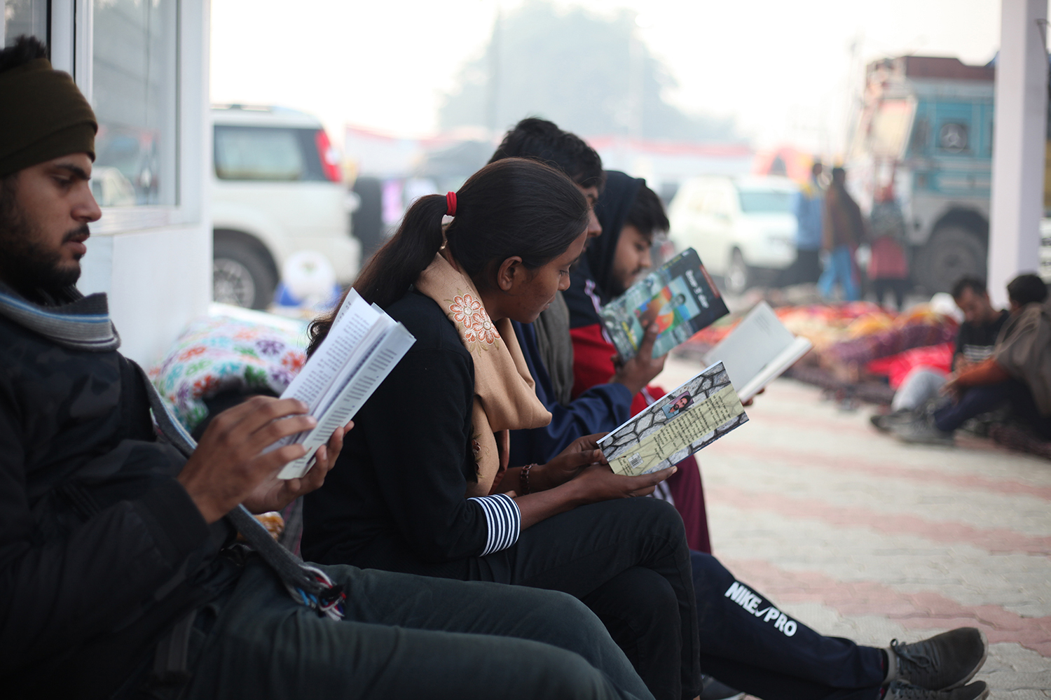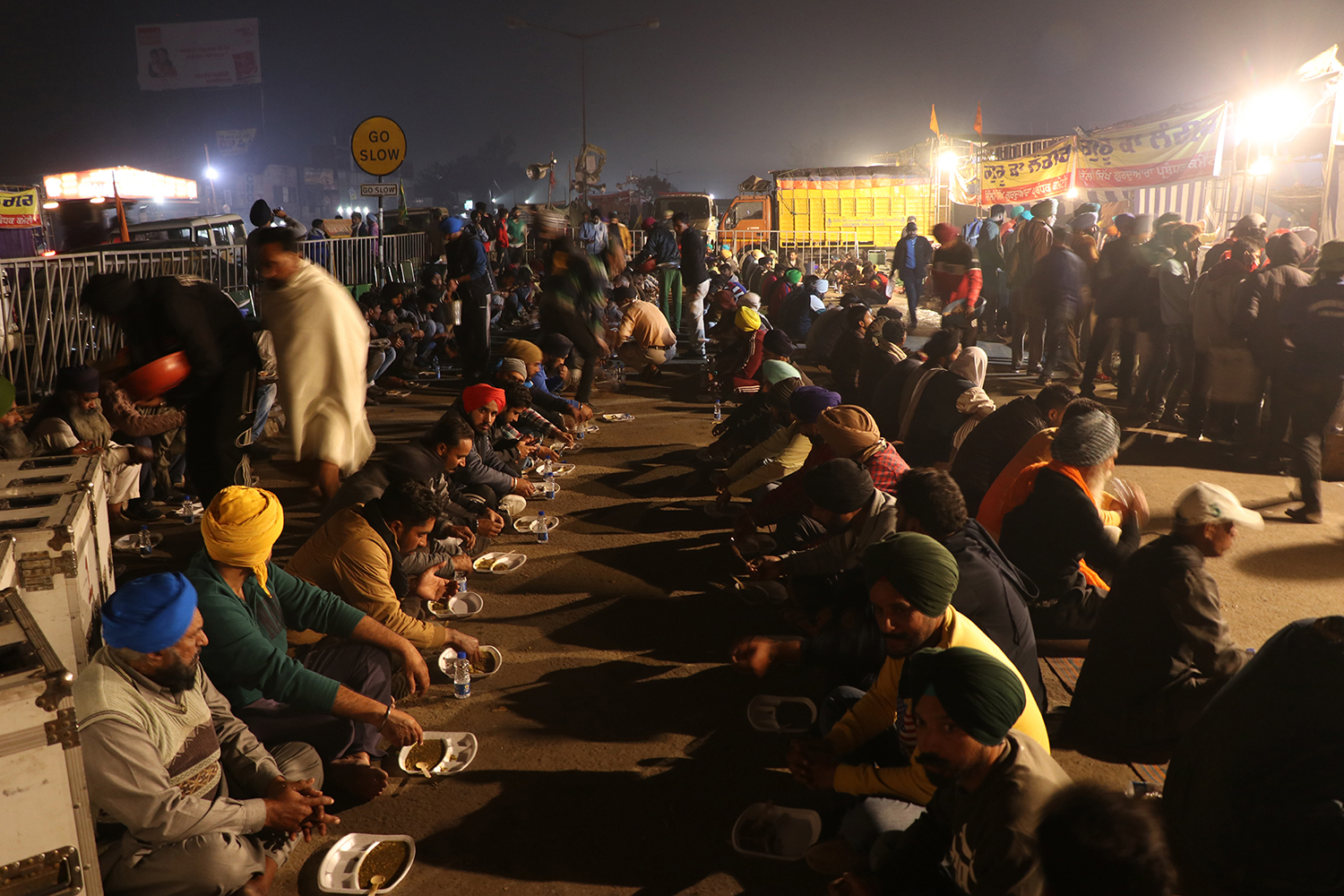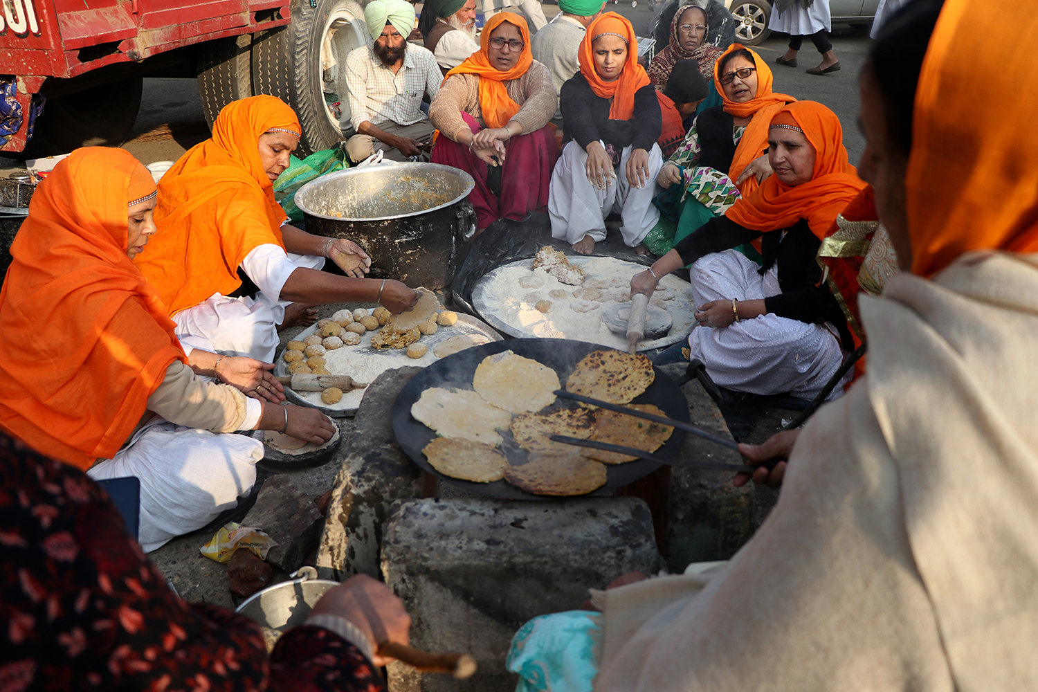 The farmers, male and female, brought their supplies with them, cooking together at the protest sites. Despite the temperature dipping considerably at night, they sleep under the tractors and trucks they drove there.
