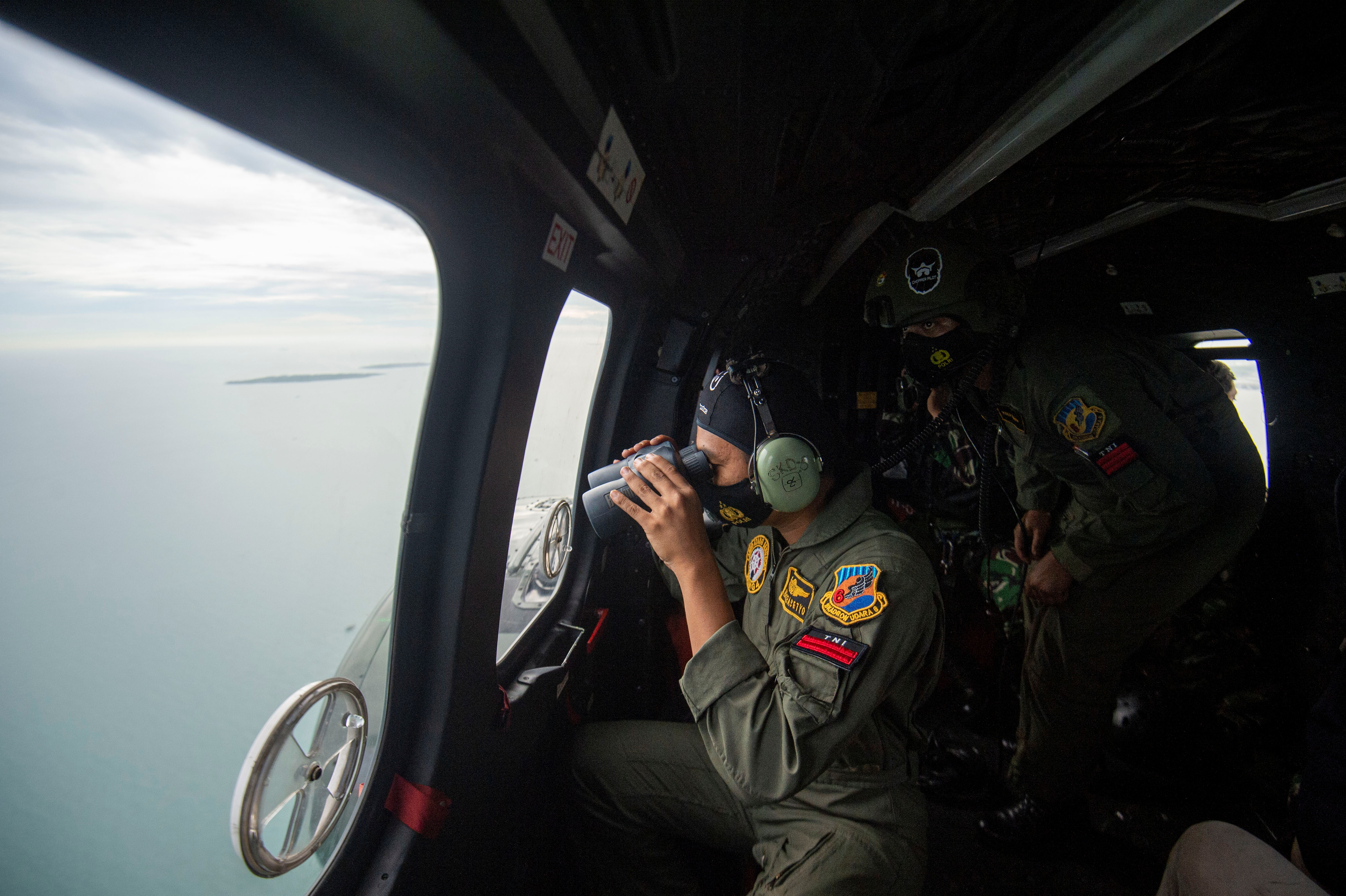 An Indonesian Air Force employee looks through the window of a NAS-332 Super Puma helicopter during an aerial search for debris from Sriwijaya Air SJ-182. [Aditya Pradana Putra/Antara Foto via Reuters]