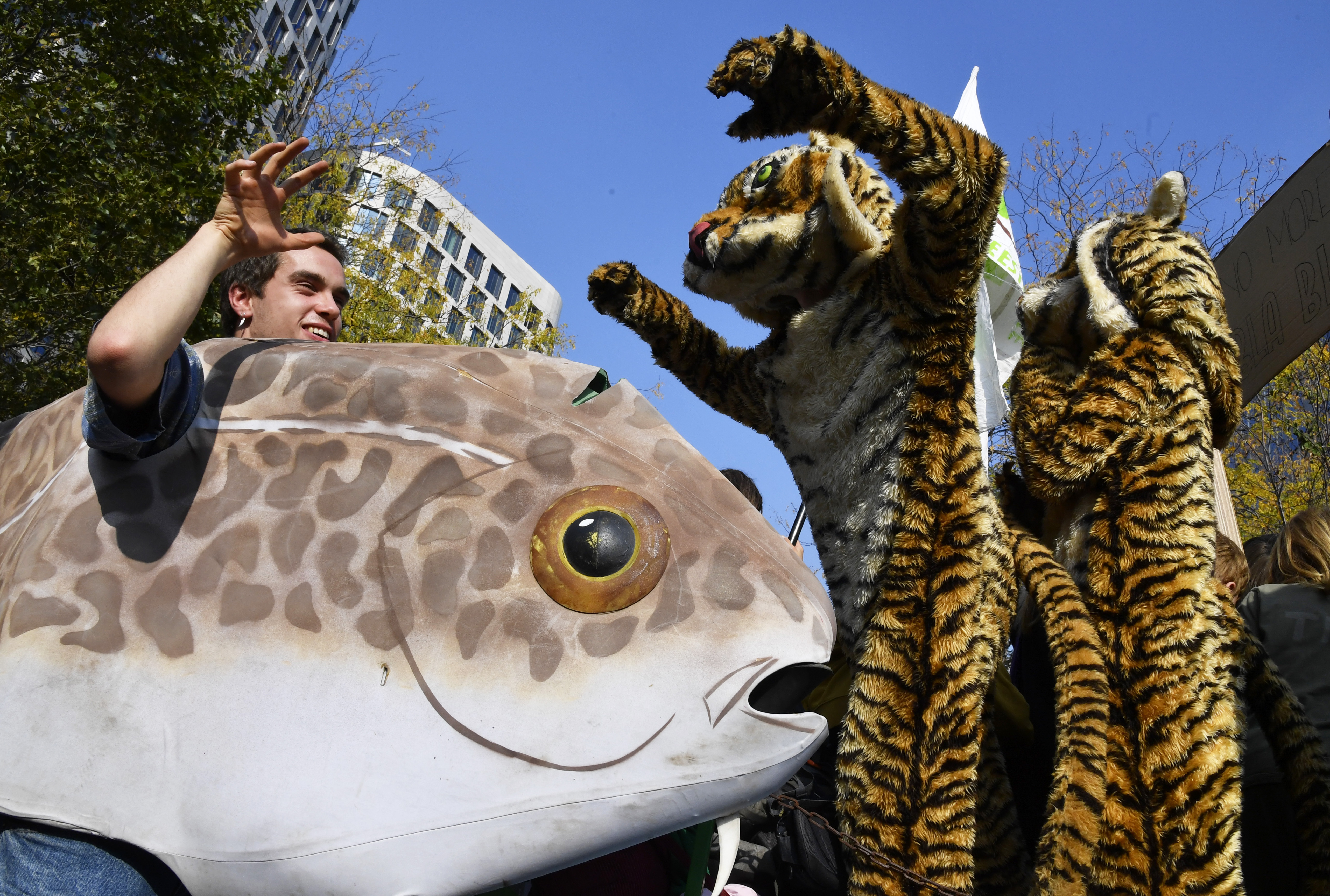 Dressed as endangered fish or tigers or wearing toy polar bears on their heads, demonstrators marched through Brussels on Sunday to push world leaders to take bolder action to fight climate change at the UN climate summit in Glasgow starting this month.