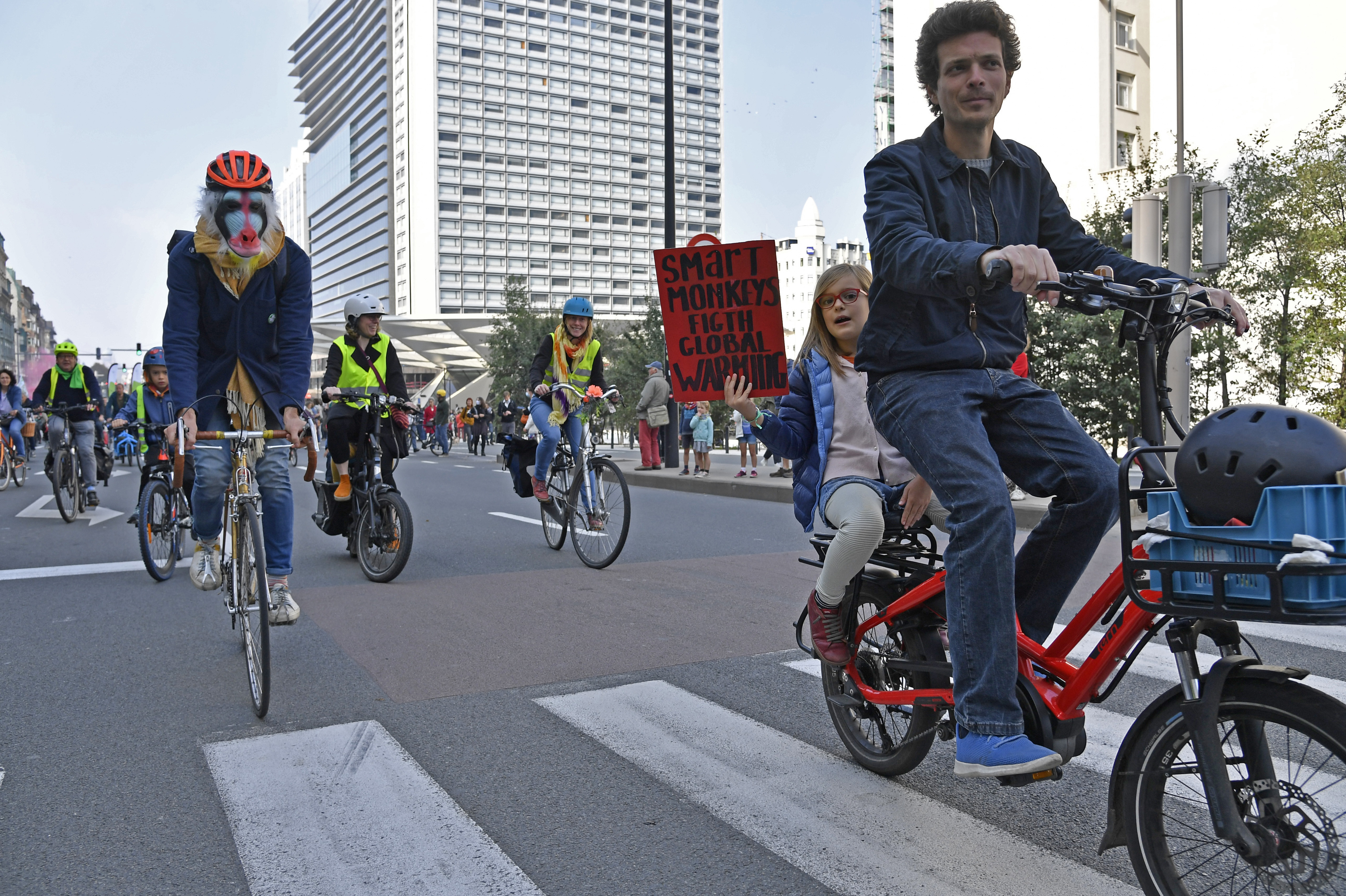Cyclists, families with children and white-haired demonstrators filled city streets, chanting slogans demanding climate justice and waving banners in English, French and Dutch. One carried a stuffed polar bear on her head, and others were dressed as animals endangered by human-caused climate change.
