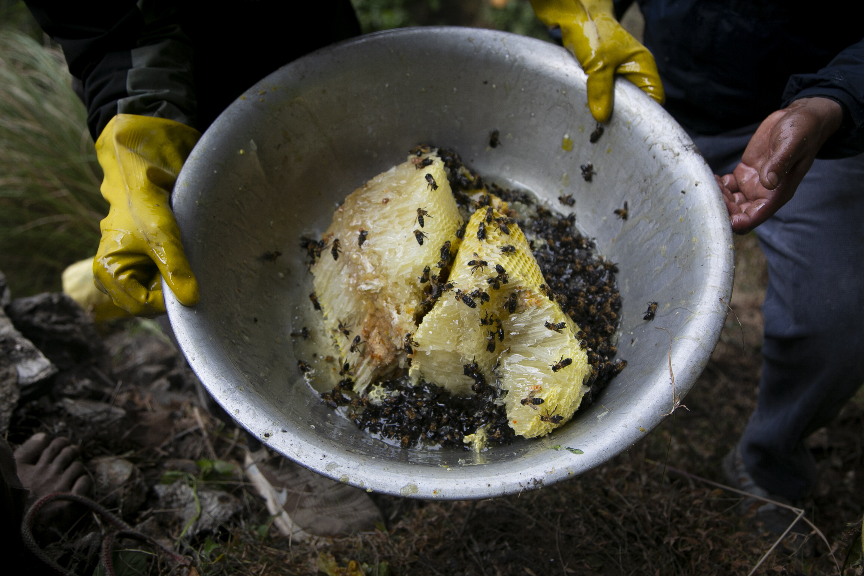 On this day, the group was able to harvest about 34 litres (nine gallons) of honey from the cliff colony. They will be able to sell it at a market for $25 a litre.
