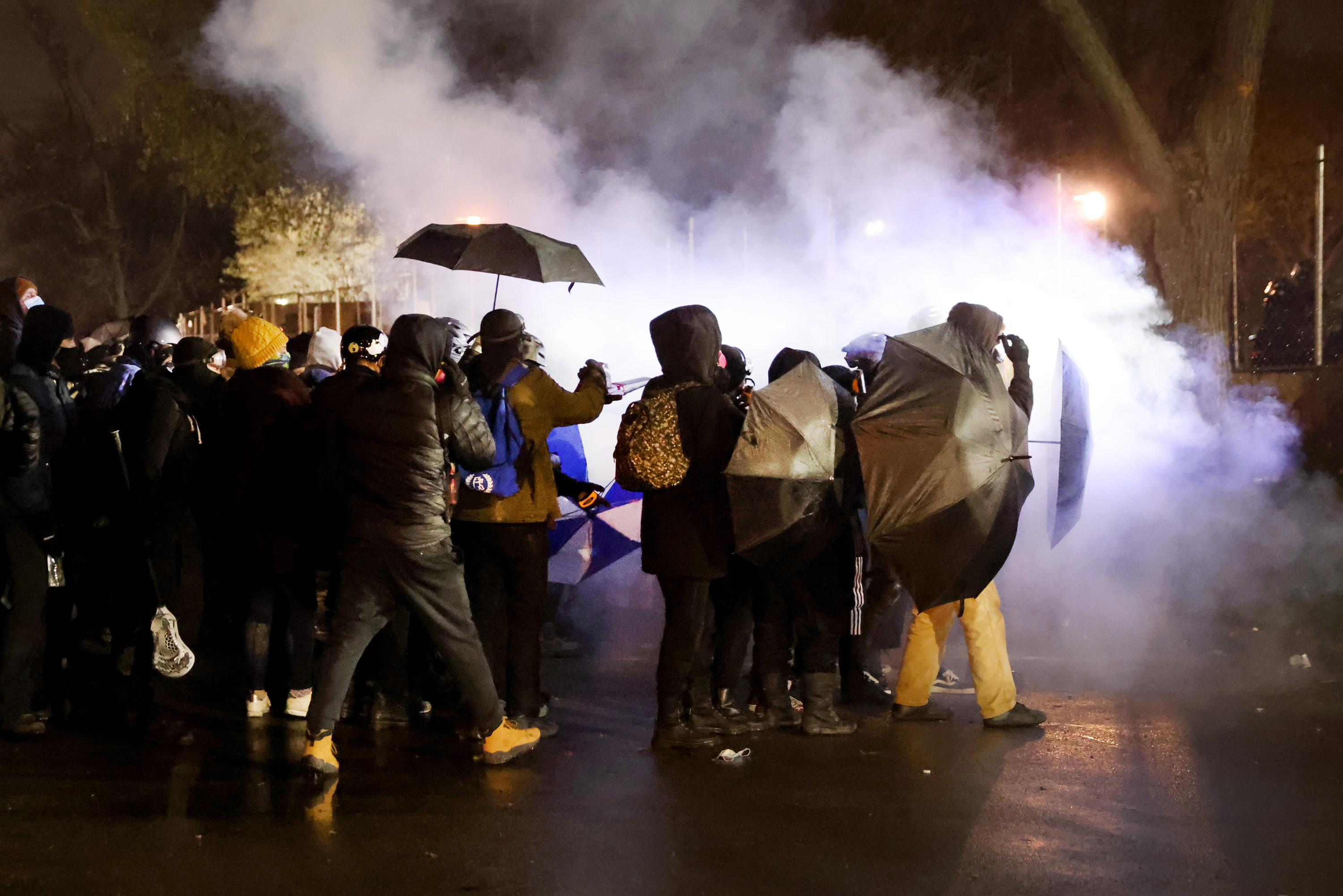 Police in the Minneapolis suburb of Brooklyn tried to chase the crowd away but some protesters picked up smoke canisters and threw them back towards police as others shot fireworks towards the patrolling officers.