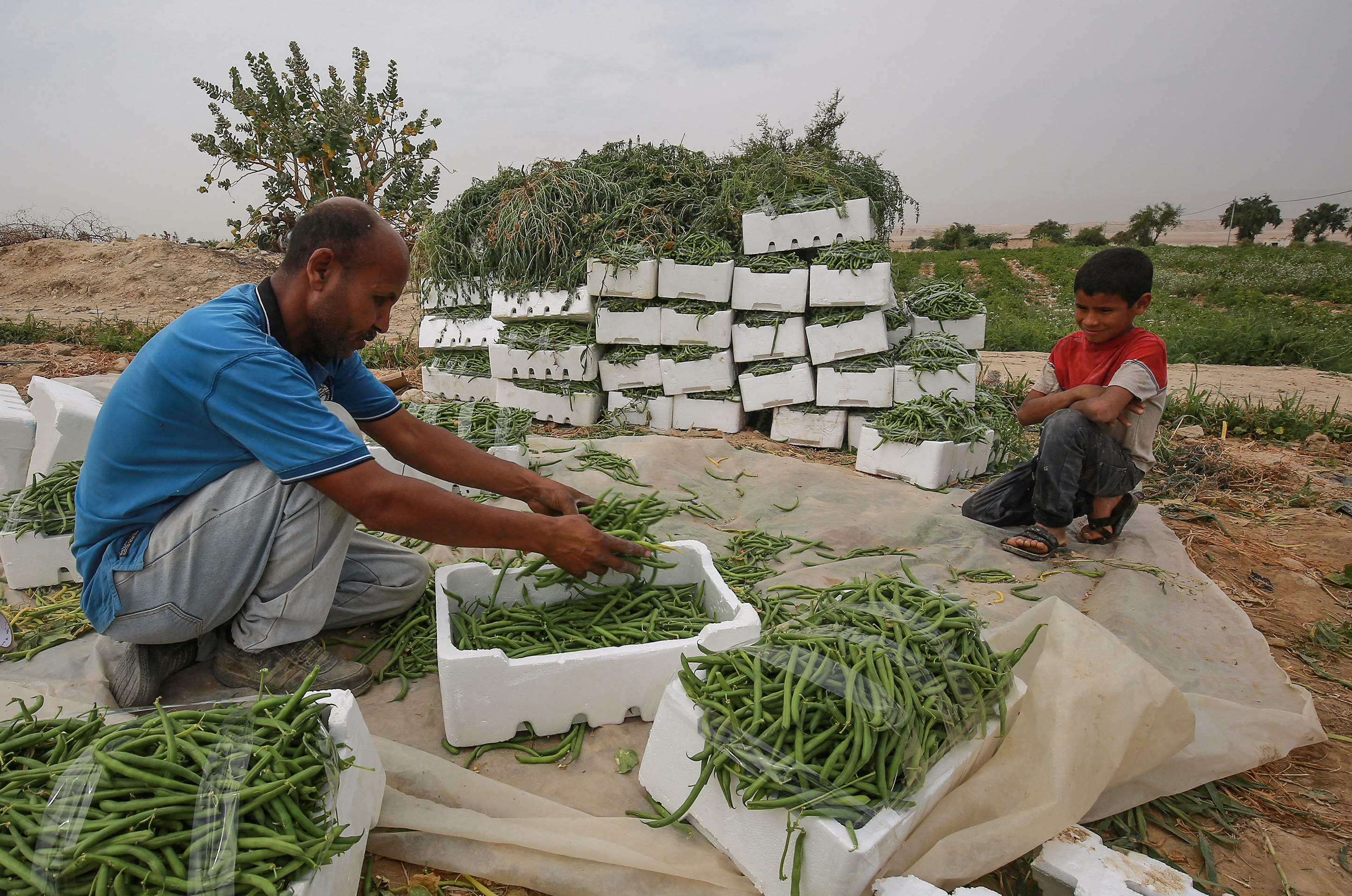 On a nearby nine-hectare (22-acre) farm, 43-year-old Ibrahim Dgheimat sits in his pickup, overwhelmed by the heat. He watches as several women pick beans.