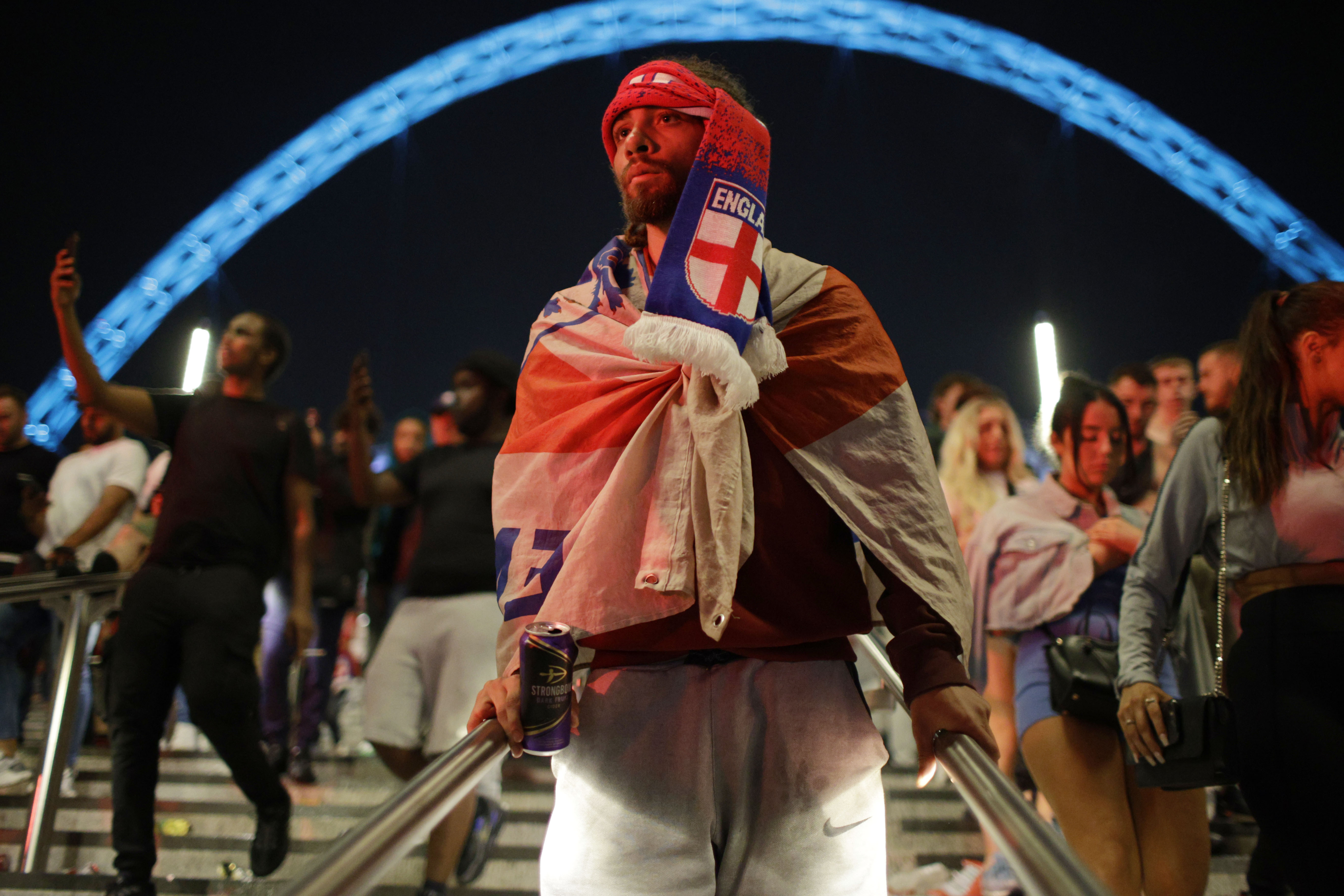 England fans outside Wembley Stadium after England lost in its first ever appearance in a European Championship final. [Lee Smith/Action Images via Reuters]