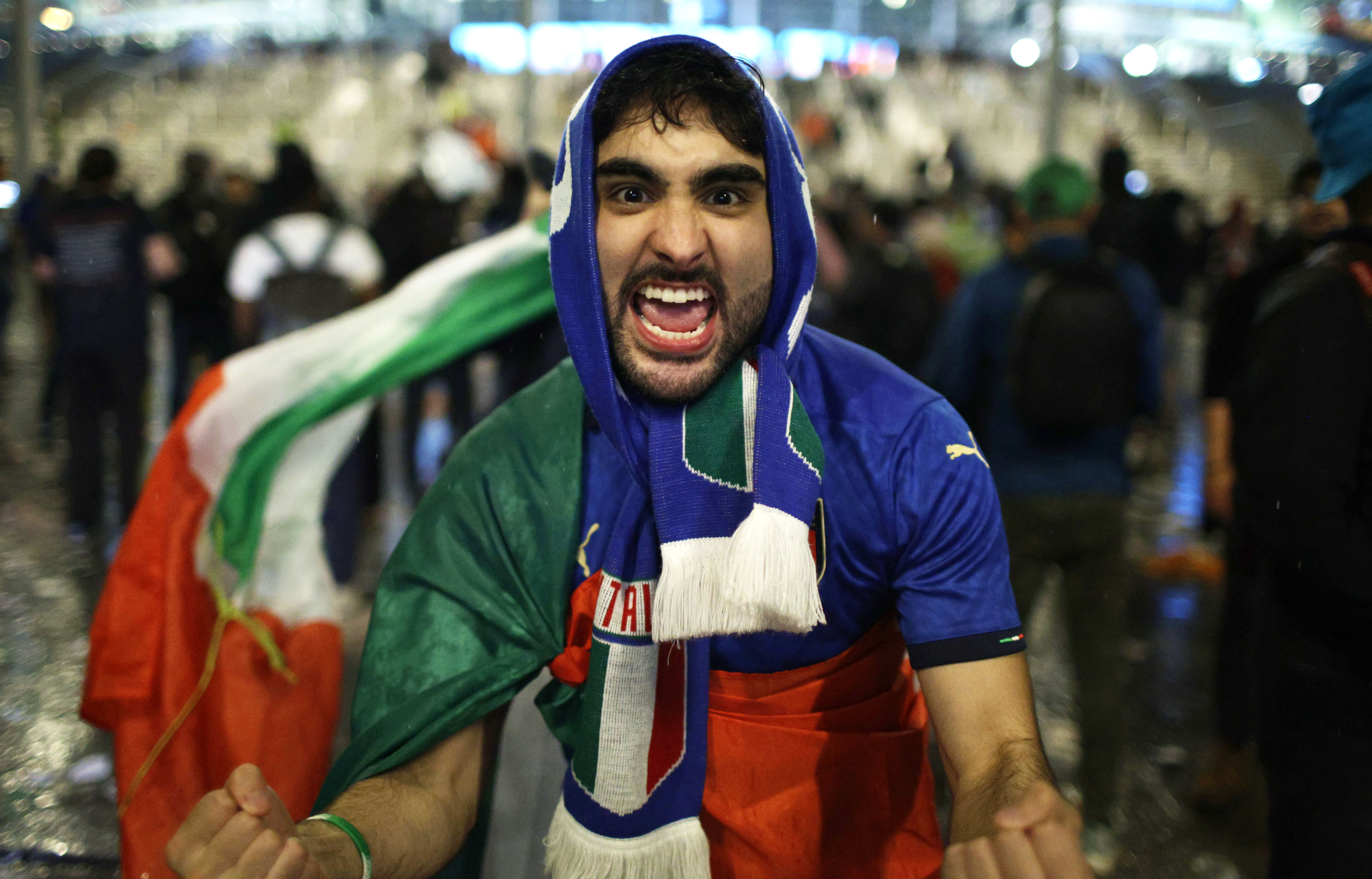 Italy fans celebrate outside Wembley Stadium after beating England 3-2 in the final on penalties. [Lee Smith/Action Images via Reuters]