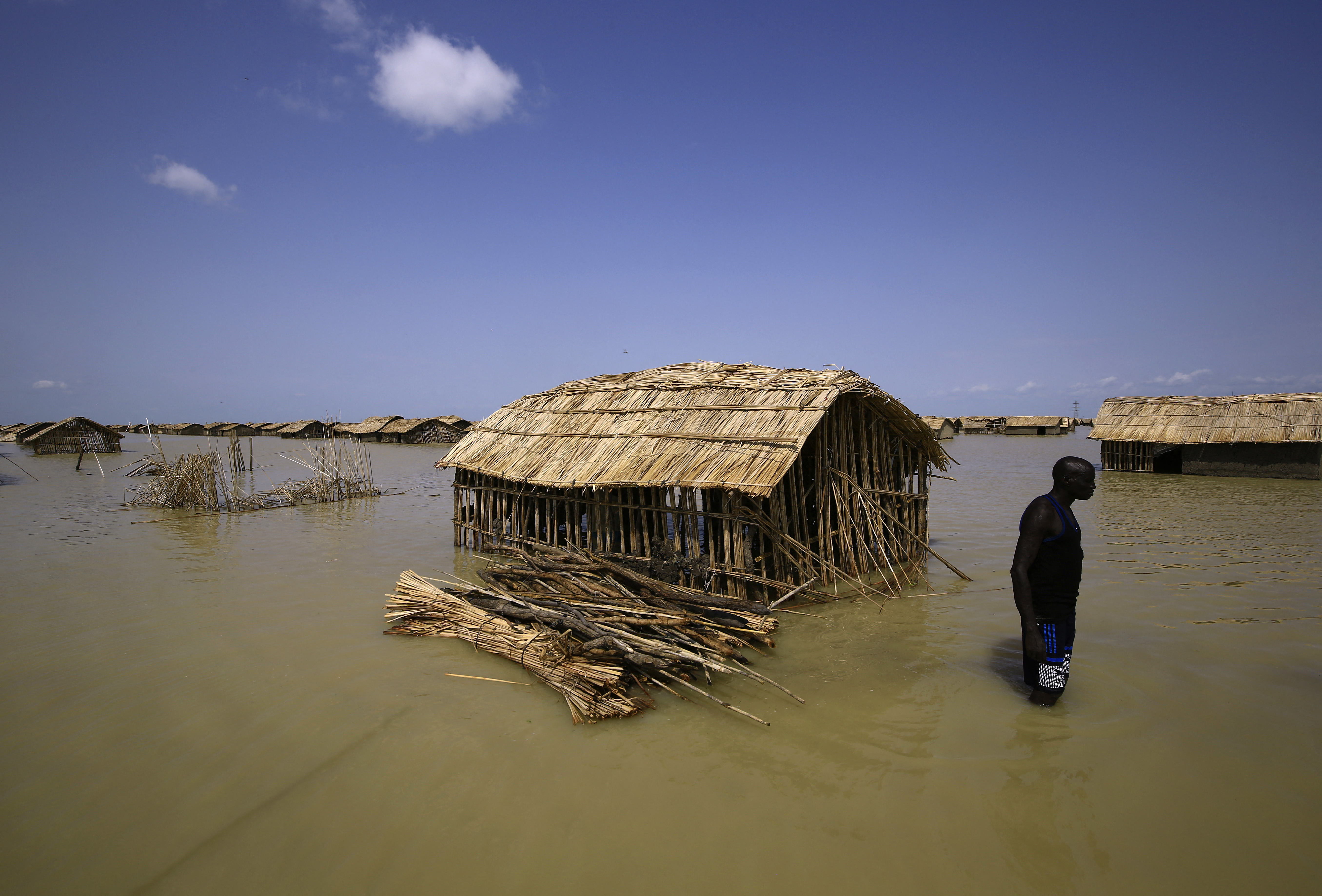 Many refugees had to make their way through stagnant floodwater to salvage building materials and belongings from the collapsed shelters.
