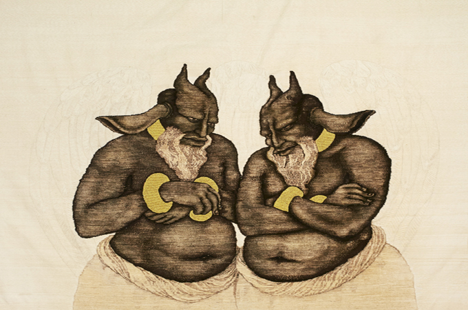 Starting this week until June 1, the fruits of Ali’s work will be showcased at Sydney’s prestigious Art Gallery of NSW. Entitled The Haunted Lotus, the exhibition comprises of nine resilient works: five paintings rendered with ink and gold leaf on wasli paper; four wool rugs made in collaboration with weavers in Afghanistan; and a looping 10-minute video showing the elaborate process where vegetables and other naturally occurring dyes were utilised to give the wool its rich earthy colours. But these are no ordinary Afghan rugs. In place of the octagonal elephant’s foot pattern or hunting and war scenes that normally adorn them, Ali’s rugs feature images of pensive donkey-eared, bearded demons.