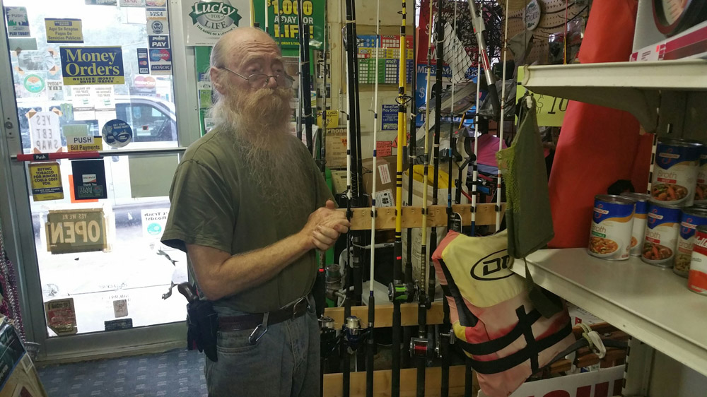 Mayatte, who walks around his shop carrying a gun around his waist like an old movie cowboy, has been running his ramshackle and cluttered business for more than 25 years and is struggling to make ends meet. He sells small grocery items such as milk, drinks, potato chips and fishing bait.