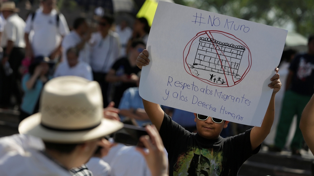A demonstrator holds a placard reading 'No wall. Respect to immigrants and human rights' during a protest against US President Donald Trump's proposed border wall [Daniel Becerril/Reuters]