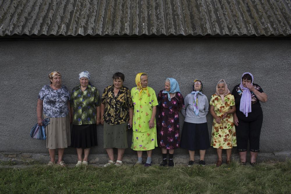 Ukrainian women from the village of Grabovye get out of the rain after attending a service led by the local priest to pray for the souls of the passengers of Malaysian Airlines Flight MH17.