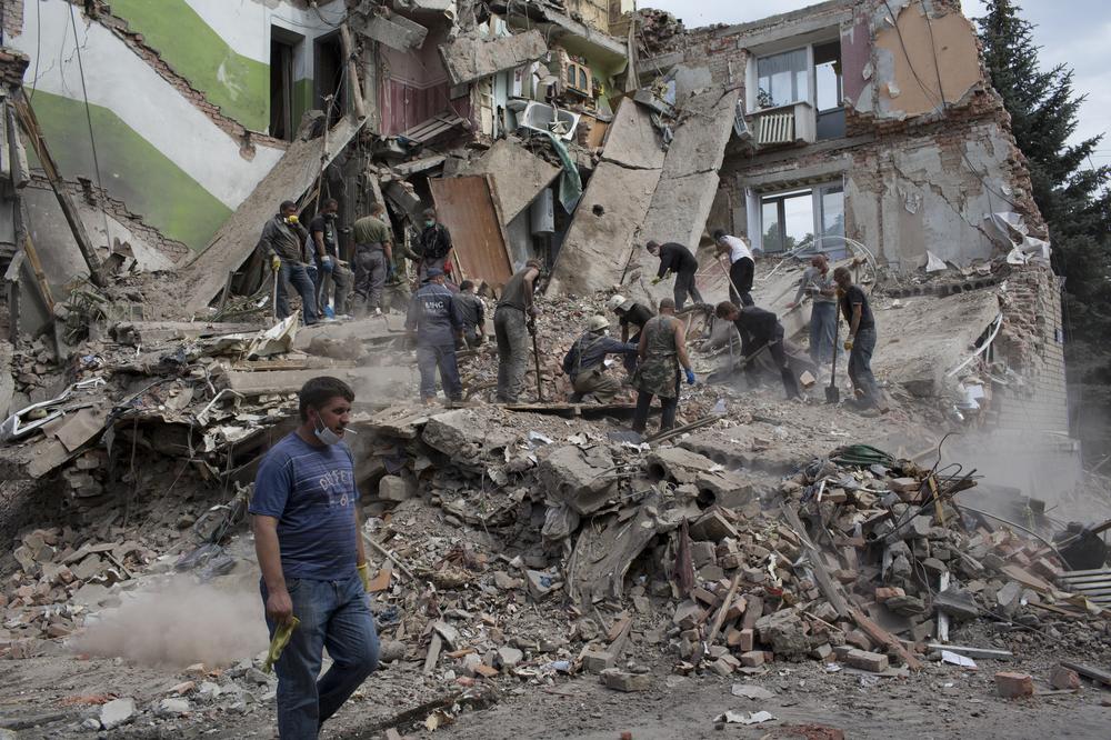 Emergency workers and volunteers cleared rubble from a residential apartment building in the town of Snizhne, a town near the Russian border, after it was hit with aerial bombs. The Ukrainian air force claimed it did not fly that day.