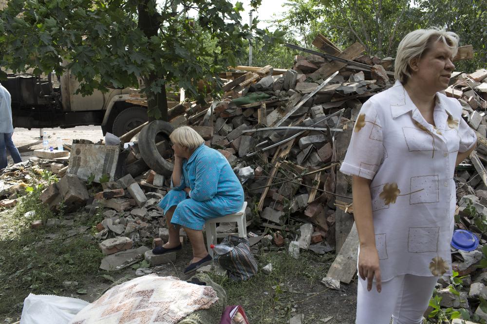 Women from a suburb of Donetsk take in the damage to an apartment building after the Ukrainian army began shelling in the area near the train station. They say there were no rebel fighters in the area.