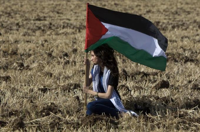 An Arab Israeli protestors holds up Pale