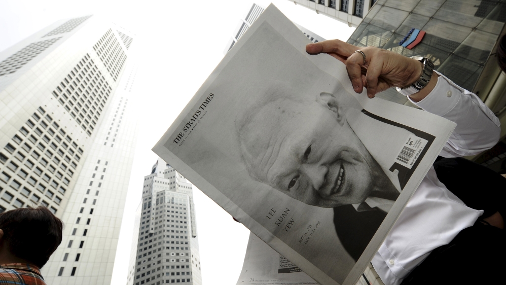 A man reads a newspaper bearing the image of Singapore''s former prime minister Lee Kuan Yew, at Raffles Place in Singapore [REUTERS]